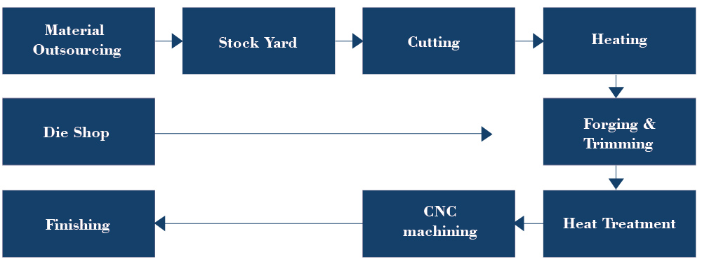 從材料進廠到成品出貨的一貫製程是我們的最大優勢,而鍛造是安大科技主要製造流程和核心技術,我們的鍛造製程包括傳統的冷鍛、熱鍛和多軸向的 3D 鍛造。